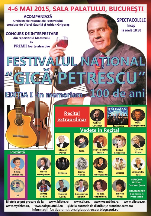 - În perioada 4-6 mai, va avea loc prima ediție a Festivalului Național de Muzică Ușoară Gică Petrescu, cu ocazia celor 100 de ani de la nașterea artistului. Festivalul se va desfășura la Sala Palatului și deja și-au anunțat participarea pentru recitaluri vedete mari. Detalii despre eveniment găsiți aici.