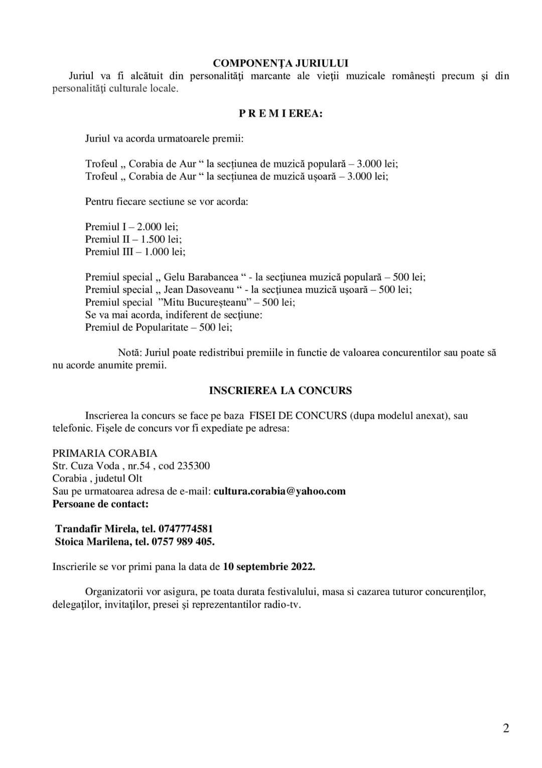 Premiile vor fi acordate atât pentru sectiunea de muzica ușoară cât și muzică populară.  Evenimentul este organizat de Consiliul Județean Olt, Consiliul Local Corabia și Centrul de Creație din localitate.
