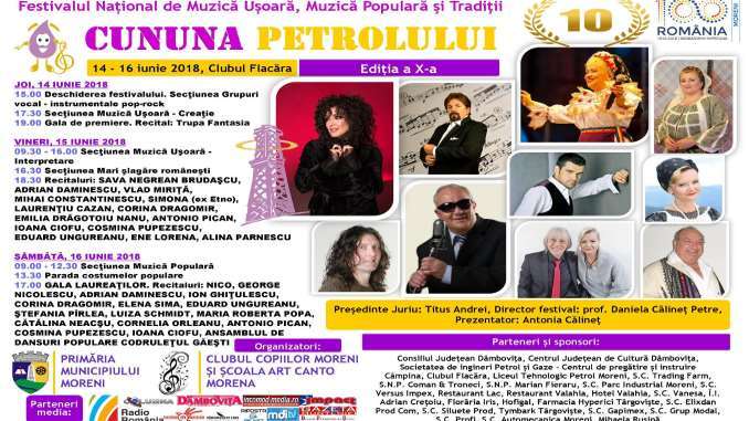 În perioada 14 – 16 iunie se va desfăşura în municipiul Moreni cea de a X-a ediţie a Festivalului Naţional de Muzică Uşoară, Muzică Populară şi Tradiţii CUNUNA PETROLULUI. Festivalul este organizat în colaborare şi parteneriat: Primăria municipiului Moreni, Clubul Copiilor Moreni – Cercul de Muzică, Şcoala Art Canto Morena, Ministerul Educaţiei Naţionale, Inspectoratul Şcolar Judeţean Dâmboviţa.