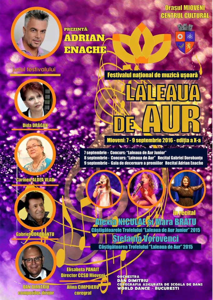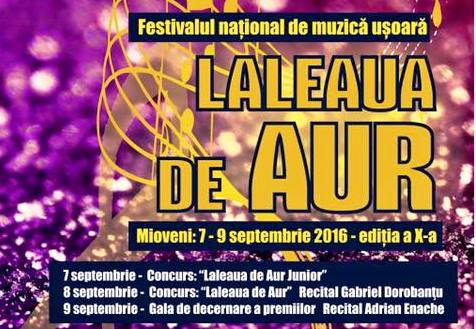 În perioada 7 – 9 septembrie la Mioveni va avea loc Festivalul – concurs Național de Muzică Ușoară “Laleaua de Aur”, competiție ajunsă la ediția a X-a și găzduită de Centrul Cultural Educativ. Organizatorii evenimentului sunt Consiliul Local, Primăria şi Centrul Cultural Mioveni. Evenimentuil va fi prezentat de solistul Adrian Enache iar pe cei selectati in festival ii poti urmari aici.