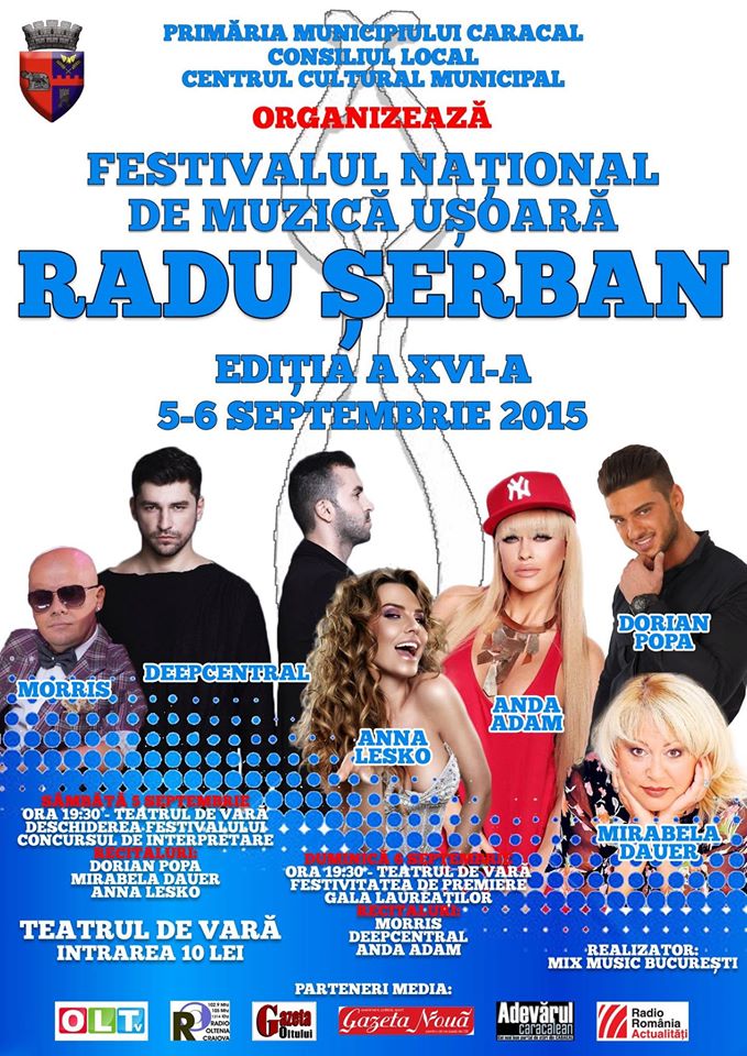 Centrul Cultural Municipal Caracal, în perioada 5-6 septembrie Festivalul Naţional de Muzică Uşoară „Radu Şerban”. Sub egida Consiliului Local şi a Primăriei municipiului Caracal sa a Festivalului Naţional de Muzică Uşoară „Radu Şerban” – concurs de interpretare, ediţia a 16-a a festivalului va aduce iubitorilor de muzică și câteva nume celebre ale muzicii românești.