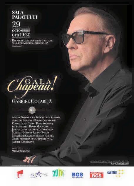 Gala „Chapeau!”, care îi este dedicată lui Gabriel Cotabiță și care va reuni artiști precum Aurelian Temișan, Luminița Anghel, Loredana și Smiley va avea loc pe 29 octombrie, la Sala Palatului, informează un comunicat al organizatorilor.