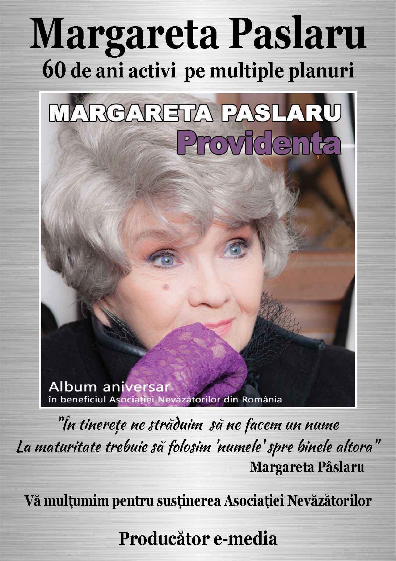 Așadar, Margareta Pâslaru, ”visătoarea care luptă pentru visele sale” vă invită să va procurați albumul aniversar ‘Providența’ în beneficiul Asociației Nevăzătorilor. Veniți joi 29 martie a.c. ora 13.00 la Magazinul Muzica!