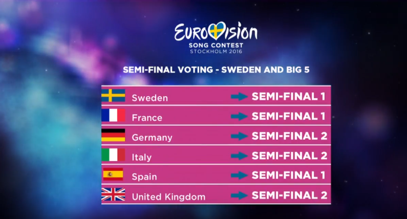 Astfel, în prima semifinală vor vota Suedia, Spania şi Franţa, iar în cea de-a doua semifinală, Germania, Marea Britanie şi Italia.