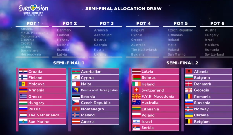 Împărţirea ţărilor participante pe semifinale este următoarea: