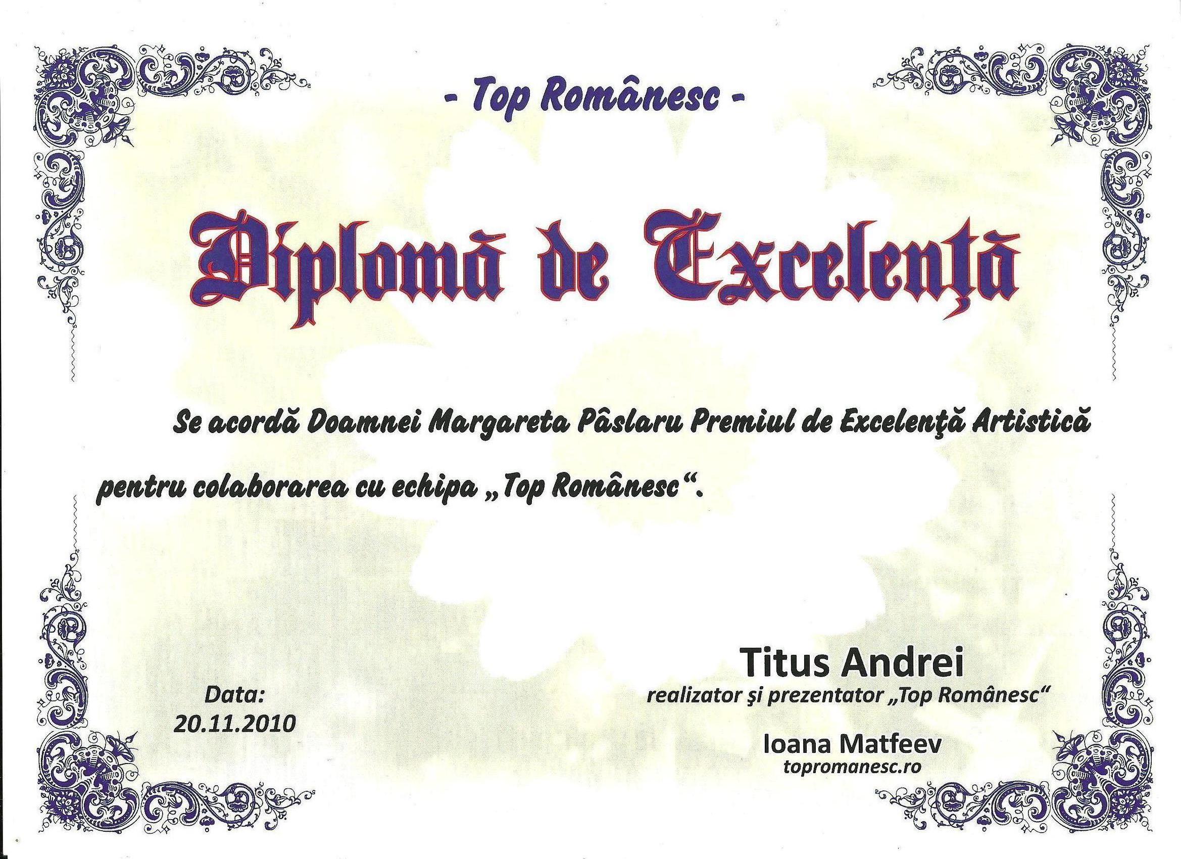 Echipa Top Românesc îşi propune ca anual să ofere o diplomă de excelenţă unui artist român care ne sprijină în demersul nostru de a informa cât mai corect şi decent prietenii celui mai longeviv clasament de muzică românească din ţară. În 2010 diploma de excelenţă pentru colaborare deosebită cu echipa Top Românesc i-a fost acordat îndrăgitei cântăreţe Margareta Pâslaru. Este prima diplomă pe care am oferit-o unui artist însă ne dorim ca această iniţiativă să devină o tradiţie pentru siteul şi emisiunea noastră. Ideea face parte din proiectul lansat recent, „Retrospectiva Top Românesc -2010” pentru că, pe lângă cele 7 categorii unde sunt nominalizaţi artiştii prezenţi la top de-a lungul anului, precum şi evenimentele despre care s-a vorbit în