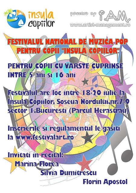 În perioada 18-20 iulie 2014, la Insula Copiilor din Parcul Herăstrău din Bucureşti, va avea loc prima ediţie a Festivalului Naţional de Muzică Pop pentru Copii “Insula Copiilor”.